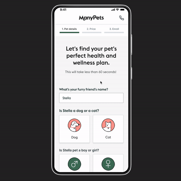 The US pet insurance market was relatively new at the time, so our aim was to educate potential customers while providing a seamless and engaging user experience during the whole purchase process.